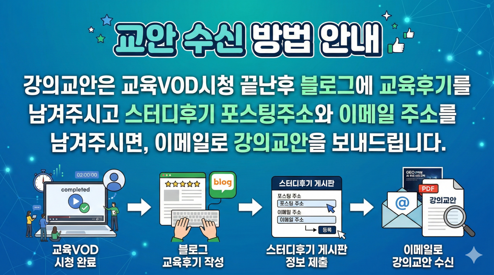 2. 수강률은 “수강한 강의 수/전체 강의 수”를 의미합니다. 콘텐츠 일부 재생 시 이용으로 간주하고 원격교습으로 수강한 경우에도 강의를 수강한 것으로 봅니다.